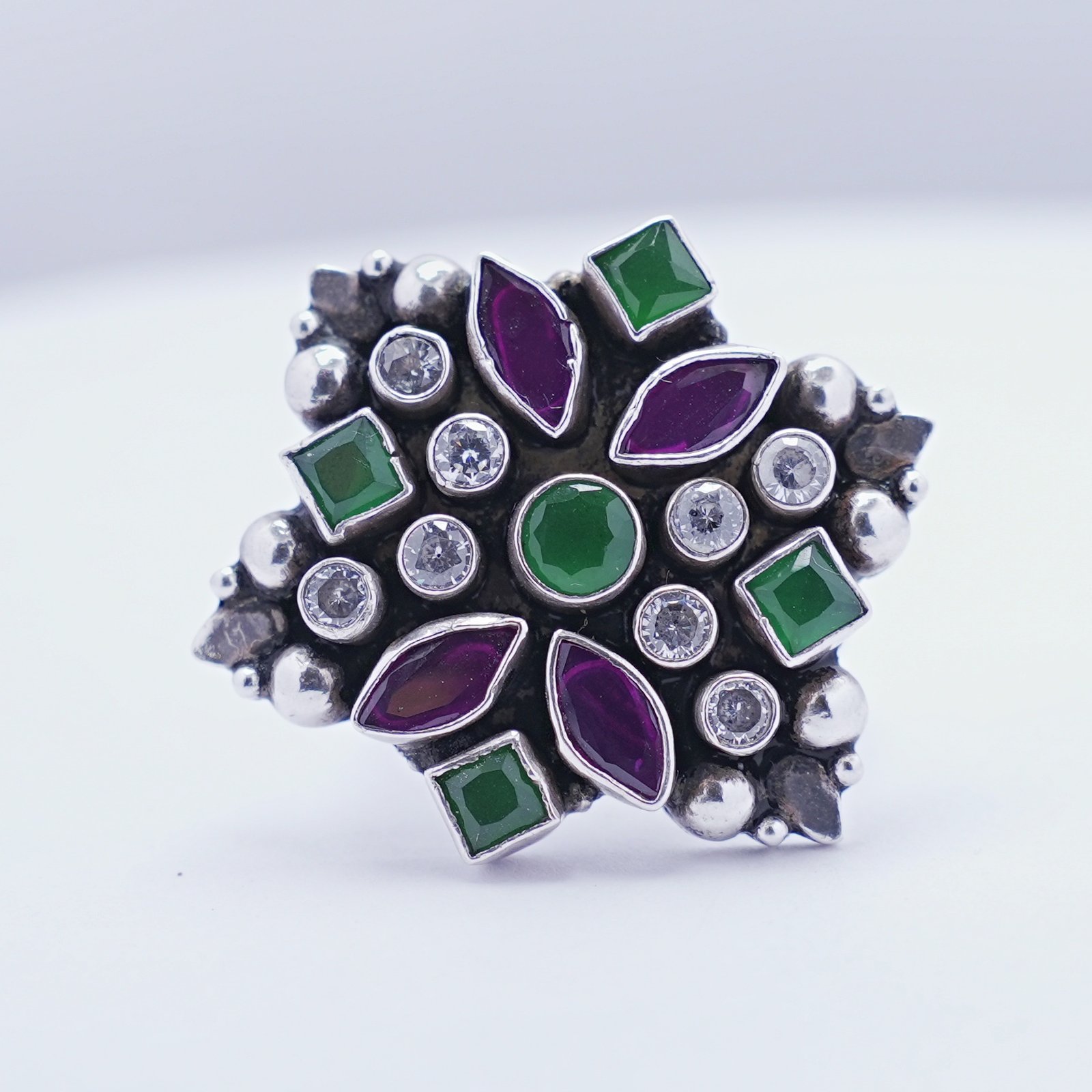Silver Nature Green Cutstone AD Modern Floral Rotatable Ring